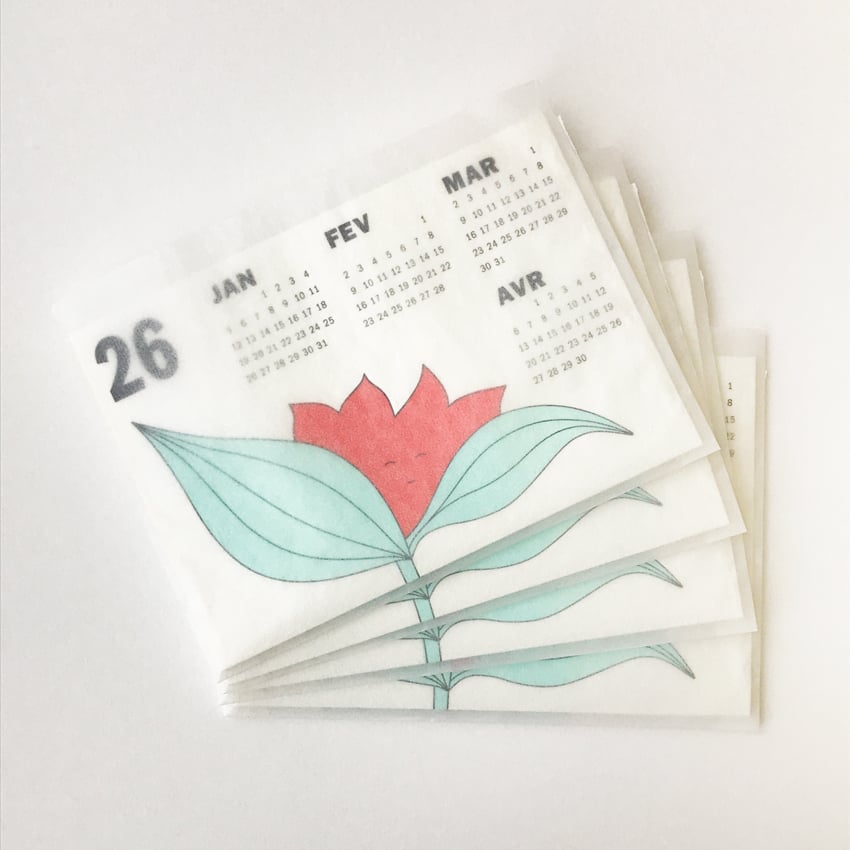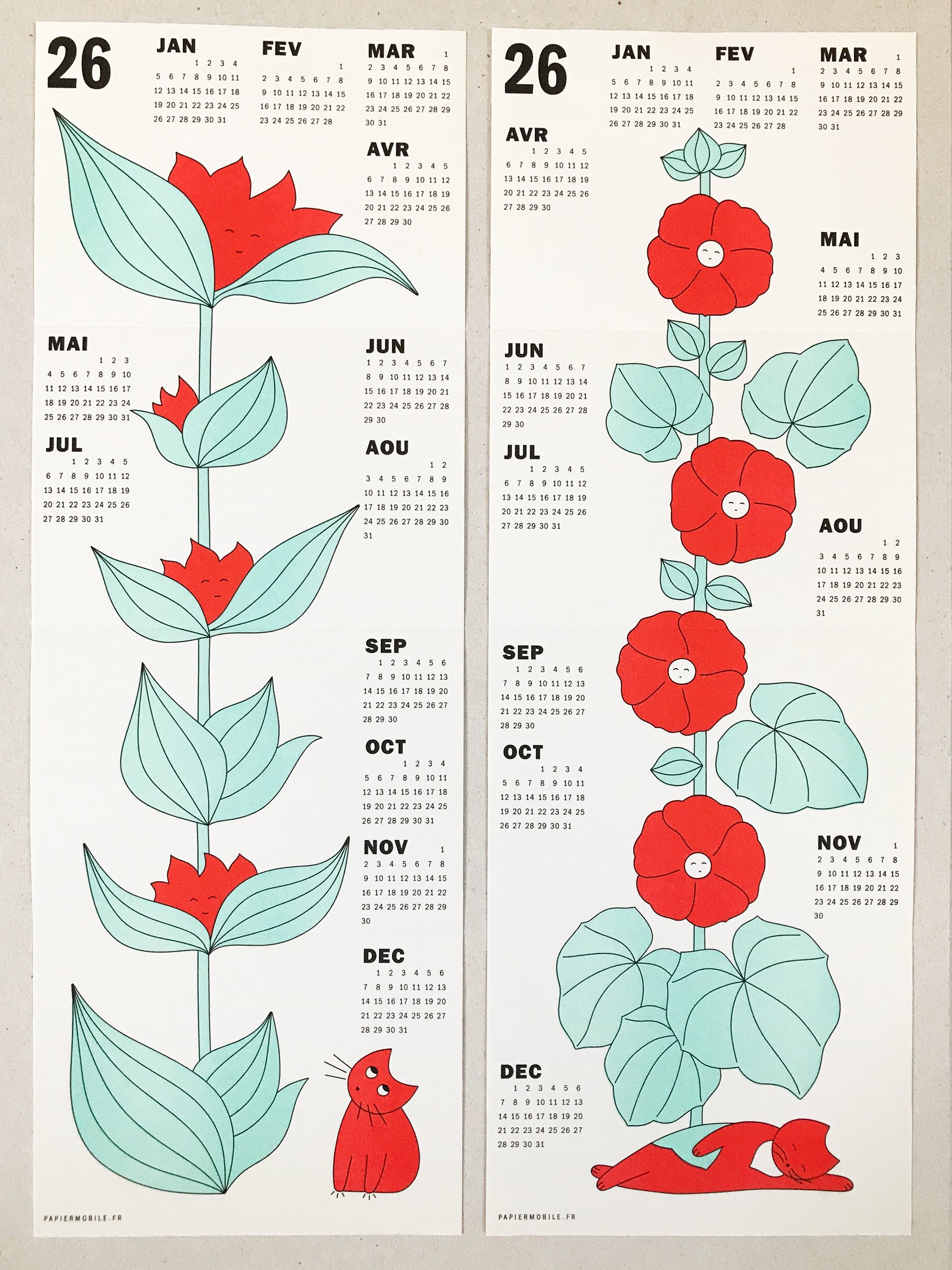 calendrier 2026, gentiane & chat . impression riso 3 couleurs menthe, rouge, noir sur papier Munken 150g . 15x42cm
